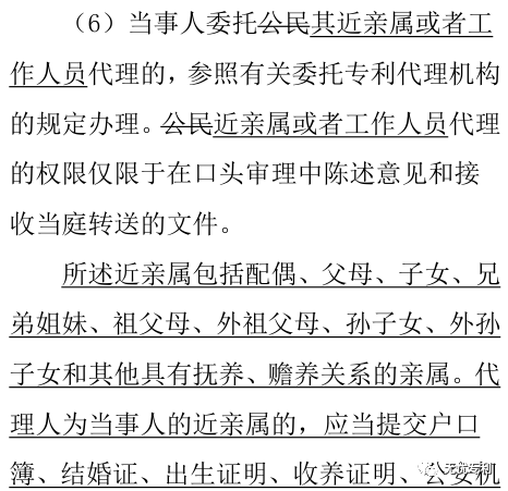 在2023年12月正式公布新的专利审查指南(专利审查指南2023)中,将公民代理的范围进一步压缩,公民代理仅限于近亲属、本单位工作人员、以及社会团体推荐的公民,去掉了“当事人认为可以维护其利益的中国公民(包括律师)”这一项规定。